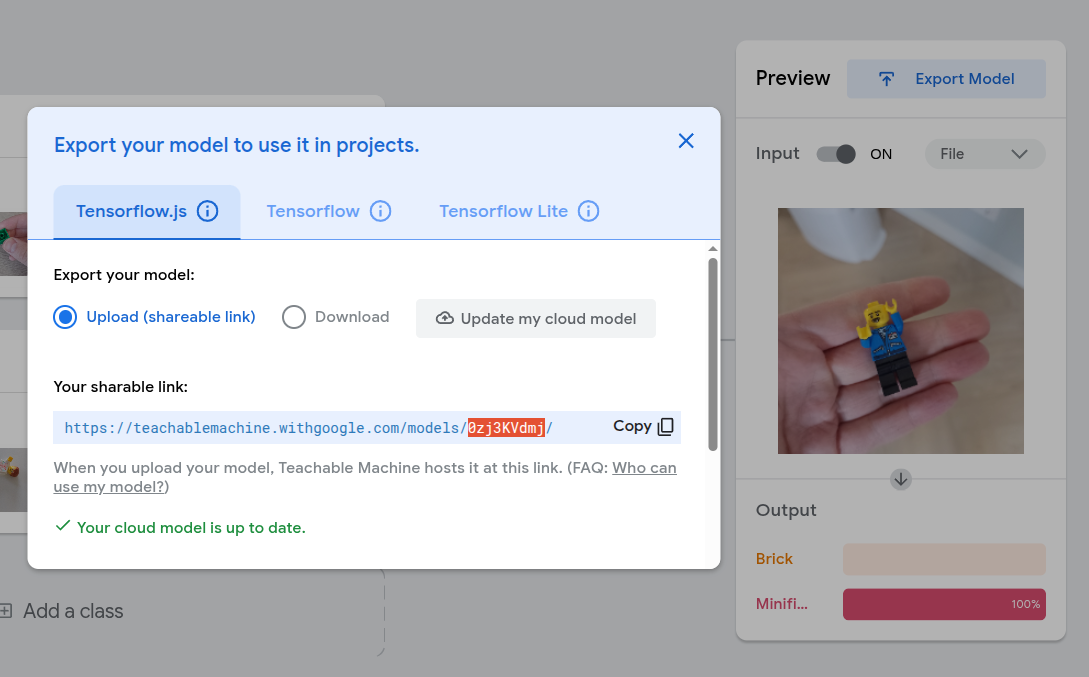 Once trained, click “Export Model”. Leave all default options in place and click “Upload my model”. Once ready, you’ll see a shareable link.