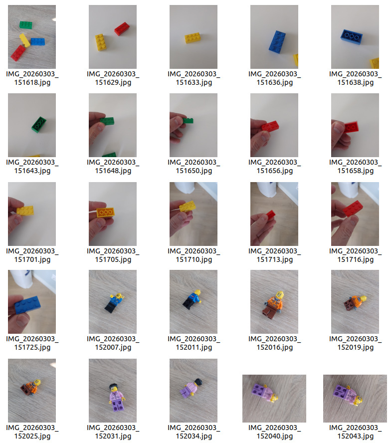 For this project, I took 26 pictures of various LEGO bricks and 45 pictures of different minifigures. Be sure to include variations in background. Also include pictures with and without your hands, and anything else that your robot could encounter.