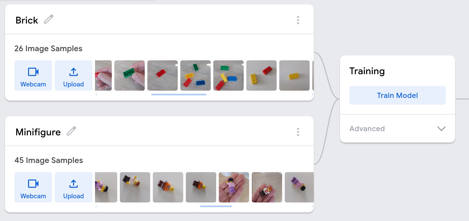 You train your model by making lots of example photos of anything that your robot may see in its final application. In this case, we need pictures of LEGO bricks and minifigures.