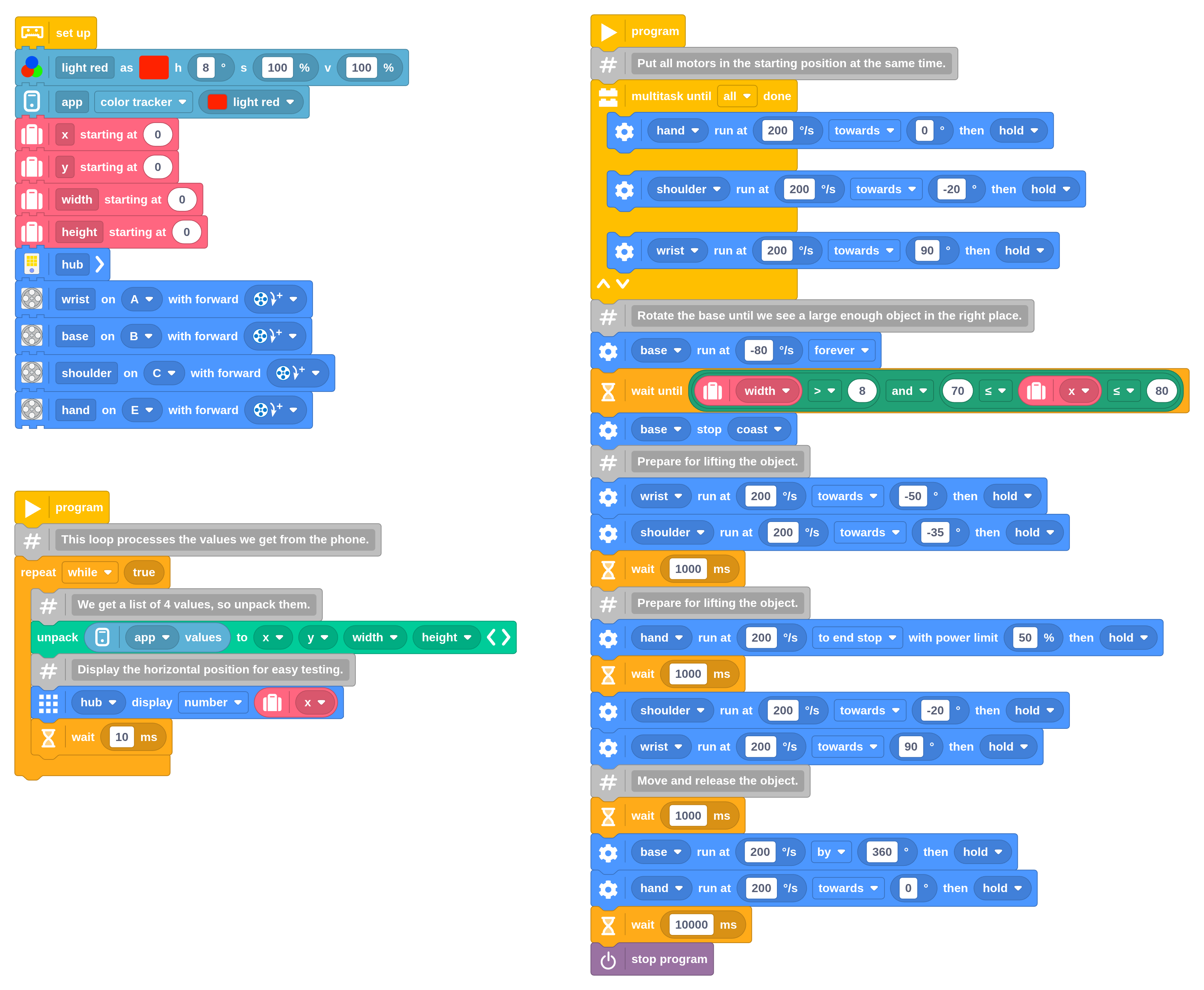 This project is a fun demo of our new smart sensor functionality. Your phone detects the position and size of a bright colored object, so your robot can find it and pick it up.